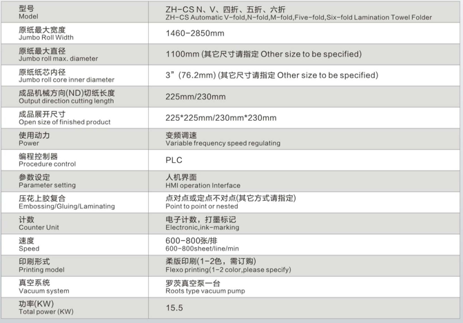 ZH-CSN(Z), V, 4-6 Hand Towel Folding Machine(Lamination) made the wiping paper or wet paper is embossed, cut by the sliting cylinders, and then inter folded into inter overlapped V/N/M/Five/Six-fold towels, can be drawn out one by one from packages and packing boxes easily. This machine is equipped with vacuum suction and automatic counting and dividing unit, it has the advantages of fast speed and accurate counting.